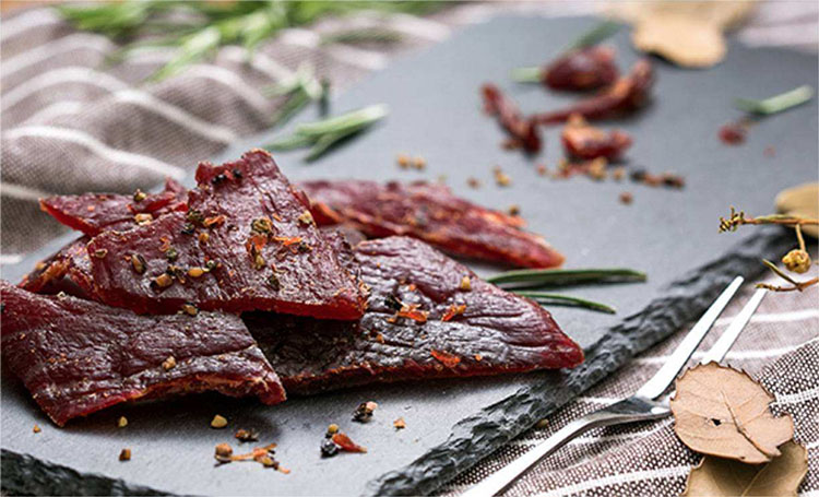 牛肉烘干:烘干的目的主要是促進(jìn)發(fā)色和脫水熟化。將鋪平在篩子上的已連成一大張的肉片放入烘干房中,烘干的溫度在55~60℃,前期烘干溫度可稍高。