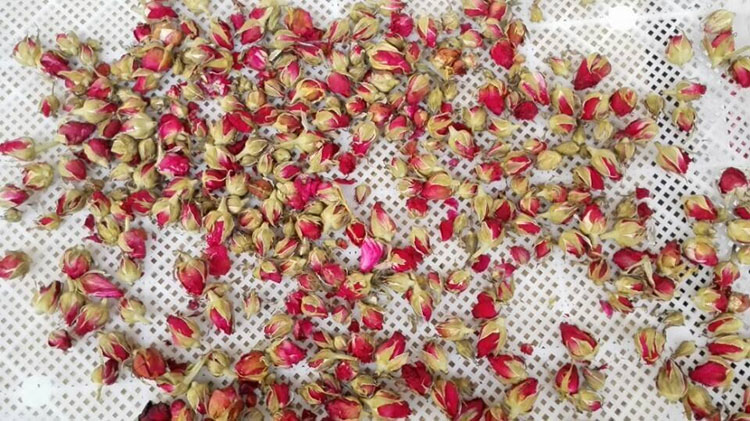 烘干前的準備是:如果花蕾是在雨后采摘,需要將其表面的水晾干后加工,如果是晴天采摘直接加工即可。首先將花蕾放在烘干盤上,還需要挑出已經開放的花朵,因為已經開發的花朵所含的營養成分較少,且花瓣容易脫落。