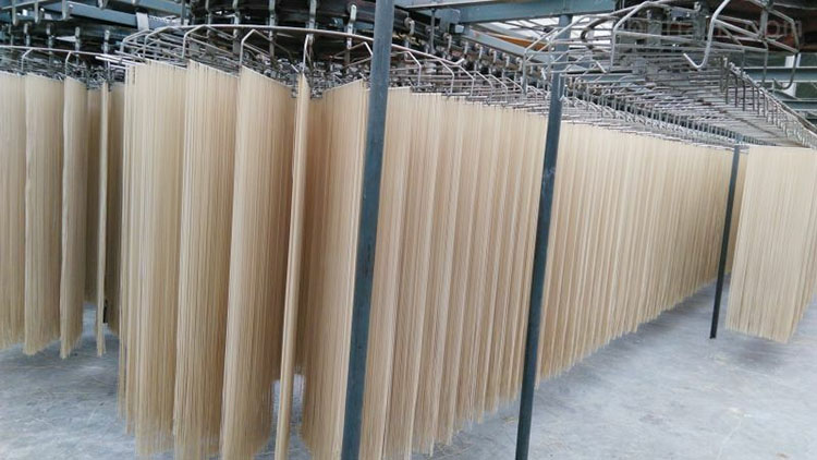 冷卻區(qū):進入冷卻區(qū)后,面條的整過制作過程基本完成,面條降溫過快,造成表面溫度過低,內(nèi)部溫度高,內(nèi)部部分水份不易排出,同樣會造成氣泡粉,也就是常說的花粉,面條也容易爆斷,煮粉的過程中容易斷粉,因此本區(qū)間是一個溫度遞減的過程,根據(jù)氣候狀況和面條的實際干濕狀況來控制溫度。
